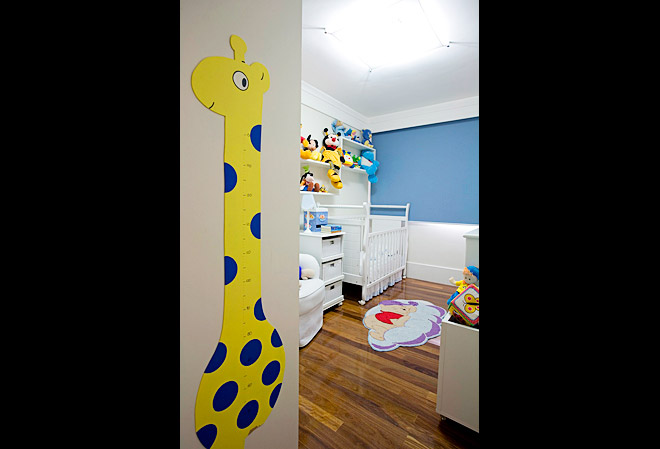 Quer personalizar ainda mais o local onde seu bebê vai dormir? Uma sugestão interessante são gravuras ou adesivos. É recomendável colocar duas ou até três em sequência na parede, até mesmo em cima do papel de parede. O cômodo idealizado por Adriana Scartaris e Samira Jarouche tinha espaço para uma girafa grande, que mede a altura de uma criança.