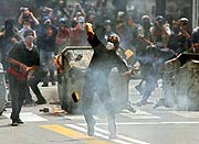 A polícia italiana interveio pela primeira vez nesta sexta-feira, por volta do meio-dia (horário local), nas proximidades do centro histórico de Gênova, para afastar cerca de 200 manifestantes antiglobalização, que protestavam contra a Cúpula do G-8.Numa viela adjacente, outro manifestantes encapuzados ameaçaram quebrar vitrines e caixas eletrônicos. Na televisão italiana, que transmite ao vivo das ruas de Gênova, era possível ver que havia fumaça na rua próxima à avenida 20 de setembro. Os manifestantes do primeiro grupo foram retirados sem violência deste local, um dos pontos de entrada da zona vermelha.
