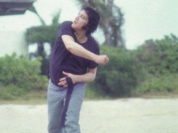 Jogando futebol americano com amigos, em março de 1977, no Havaí
