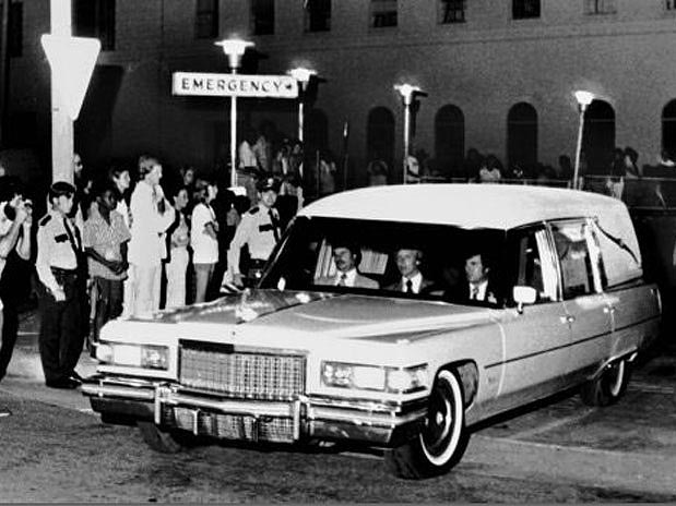 Rabecão com o corpo de Elvis deixa o Baptist Memorial Hospital, em Memphis