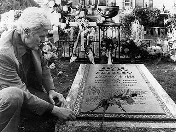 O pai de Elvis deposita uma rosa no túmulo do filho, em Graceland, em novembro de 1977 - quando o corpo do cantor foi exumado do cemitério Forest Hills e transferido para os jardins da famosa mansão do astro
