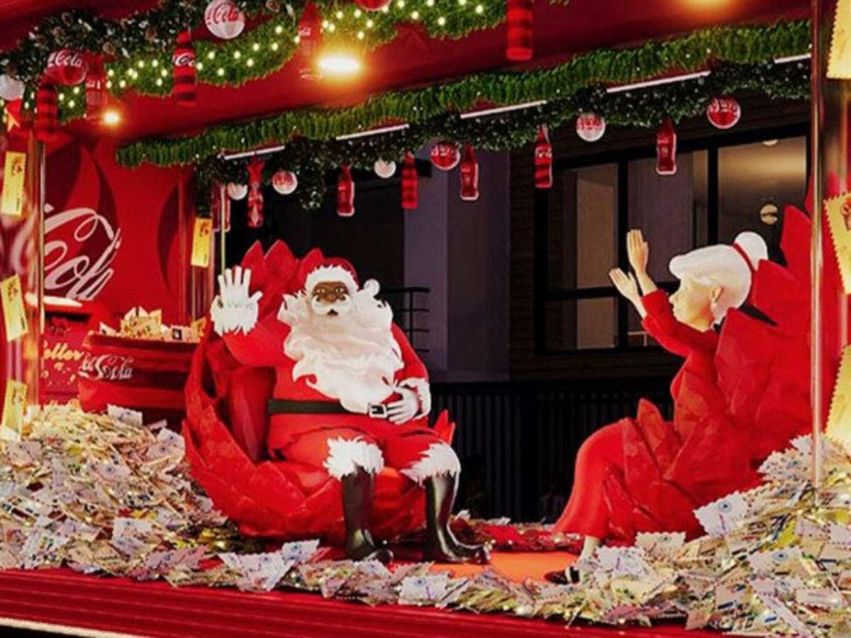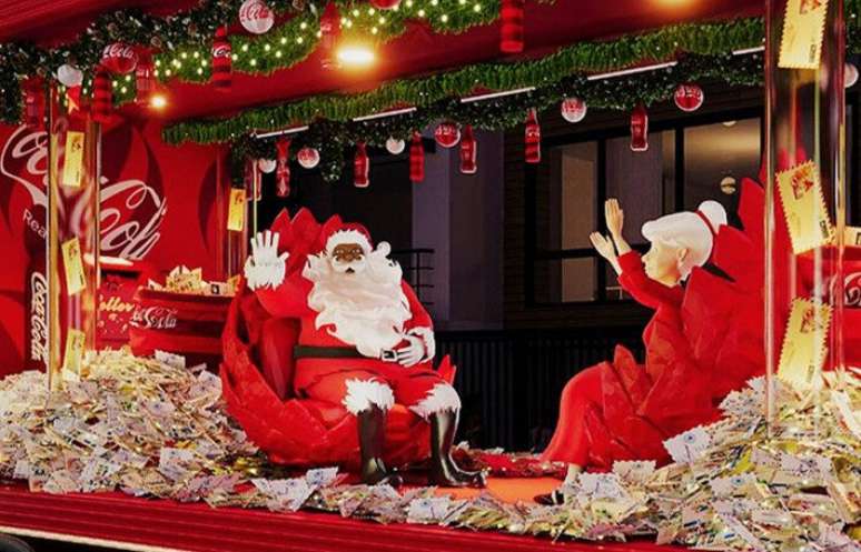 Animação colorida. É noite. Em uma praça céu aberto, pessoas caminham ao redor de uma enorme árvore de Natal que se ilumina com luzes amarelas, enfeites e uma estrela vermelha no topo. Na base da árvore de Natal da Coca-Cola Fensa Brasil, uma grande tenda circular com listras vermelhas e brancas cobrem um carrossel que gira ao redor da árvore. Adentra-se uma porta em arco com o logotipo da Coca-Cola na parte superior, nas laterais as soldadinhas e bengalas de açúcar com listras Brancas e vermelhas. Embaixo da tenda Uma grande árvore de Natal e diversas caixas De presentes brancas com laços vermelhos Em frente a uma guirlanda e uma poltrona Vermelha, papai e mamãe noel sentados lado a lado Do lado de fora, na tenda vermelha O detalhe de lâmpadas circulares amarelas Acima da inscrição em branco de uma garrafa de Coca-Cola O carrossel gira em volta da árvore Seus carrinhos possuem formatos de enfeites de Natal Como bolas vermelhas e renas Percorre-se a base da árvore com soldadinhos Bonecos de neve, garrafas de Coca-Cola Grandes bolas vermelhas com detalhes Brancos, bengalas de açúcar, ursos brancos, corações vermelhos e espaços diversos, como uma sala com lareira e árvore de Natal, urso sob a neve e uma grande mesa de alimentos de ceia. Em uma janela com borda vermelha, um Papai Noel em um trenó repleto de presentes e uma rena. Em outra janela sob a neve, dois bonecos de neve e um pinguim com cachecol ao lado de uma árvore de Natal. Em outra janela, uma mesa com presentes, Mamãe Noel beija o rosto de Papai Noel. Em outra janela, uma sala com lareira acesa entre uma árvore de Natal e uma poltrona vermelha. Em outra janela à esquerda um iglu e uma família de três ursos sobre a neve. Em outra janela uma mesa farta com alimentos de ceia cercada por presentes, grandes bolas vermelhas e árvores de Natal. Do lado de fora sobrevoa-se a enorme árvore de Natal com efeitos vermelhos, brancos e dourados, decorações, bolas, soldadinhos, coca-colas e a grande estrela vermelha acesa no topo.