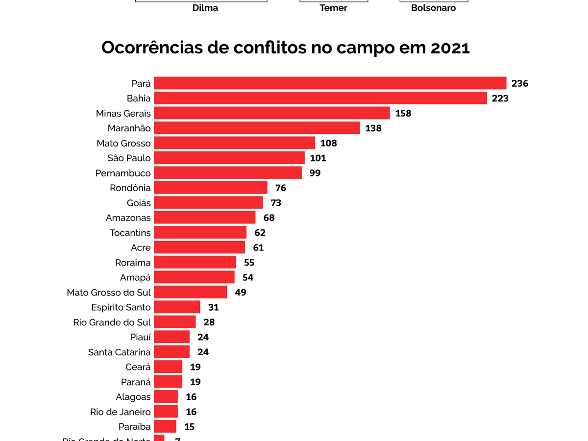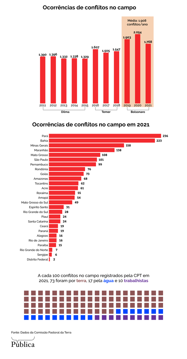 Os conflitos no campo seguiram acima da média no terceiro ano do governo Jair Bolsonaro (PL). Em seu levantamento anual, “Conflitos no Campo Brasil 2021”, a Comissão Pastoral da Terra (CPT) registrou 1.768 ocorrências, uma média de 34 por semana. Nos dois primeiros anos de Bolsonaro na presidência, foram computadas 1.903 e 2.054 ocorrências, respectivamente. A média para os 18 anos anteriores, entre 2001 e 2018, é de 1.408 ocorrências de conflitos.