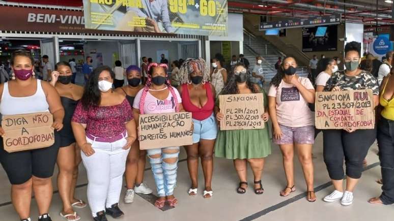 Com cartazes com frases 'Diga não à gordofobia' e 'Acessibilidade, Humanização e Direitos Humanos', as ativistas também cobraram pela aprovação de projetos de lei (PL) que promovem ações de conscientização contra a gordofobia, como o PL nº 23.507/2019, que determina a criação do Dia Estadual de Combate à Gordofobia na Bahia. O texto ainda aguarda a aprovação do governador Rui Costa (PT).