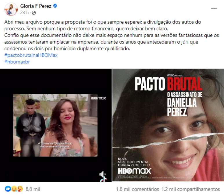 A autora de novelas Gloria Perez usou o Facebook para explicar porque decidiu colaborar com o projeto de "Pacto Brutal: O Assassinato de Daniella Perez", série documental produzida pela HBO Max sobre o assassinato de sua filha. Até então, ela só tinha falado sobre a morte de Daniella de forma breve e em raras ocasiões.