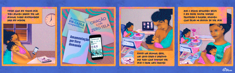 Na página seguinte, ele diz dos efeitos positivos da amamentação por livre demanda, da maternidade com apego e da criação com zero tela. Mas quem consegue dar o peito o dia inteiro, atender prontamente todos os pedidos de colo do bebê, entregar um último relatório de trabalho e ainda ter força para entreter a criança só com uma mistura de brinquedos montessorianos e massinha de modelar feita em casa, sem apelar por míseros 15 minutos para a “Galinha Pintadinha” no celular?