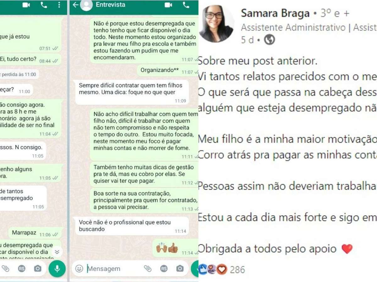 Logo em seguida, o recrutador escreveu que é “sempre difícil contratar quem tem filhos”. Dias após a publicação que recebeu mais de 26 mil curtidas, Samara compartilhou que recebeu vários relatos parecidos com o dela e disse seu filho é sua maior motivação. "Corro atrás para pagar as minhas contas e não deixar faltar nada para ele", escreveu ela.