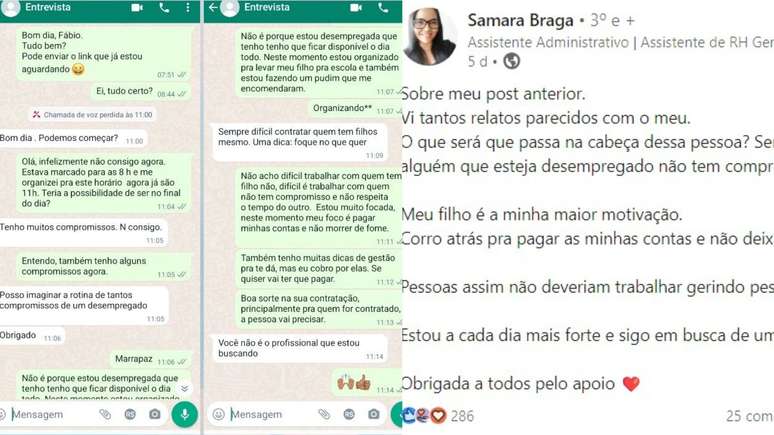 Samara Braga, de 32 anos, esperou por três horas para fazer a entrevista online com o recrutador que se atrasou. Ao ser perguntada se poderia participar da entrevista às 11h, ela respondeu que não conseguiria. “Estava marcado para às 8h e me organizei para este horário, agora já são 11h”, escreveu ela, perguntando em seguida se poderiam fazer a entrevista no final do dia.