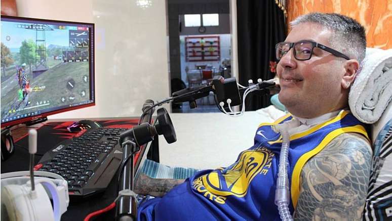 Deitado na cama e com as costas escoradas por travesseiros, Erik Tiago Leme, de 38 anos, assopra os três bocais de um controle de eSports (esportes eletrônicos) fixado na altura do rosto. Com a boca, ele faz o seu avatar do Free Fire, um jogo online de aventura, saltar, se agachar, atacar e atirar. Pelo mesmo aparelho, usa a boca e o queixo para movimentar a câmera que exibe seu personagem. "Esse controle tem três furos. Se assoprar o do meio, ele atira. Se assoprar o do meio junto com o buraco esquerdo, ele pula. Foi difícil se adaptar no começo, mas agora está bem mais tranquilo", conta o gamer sobre o Quadstick, um aparelho feito especialmente para gamers com deficiência e mobilidade reduzida conseguirem jogar.