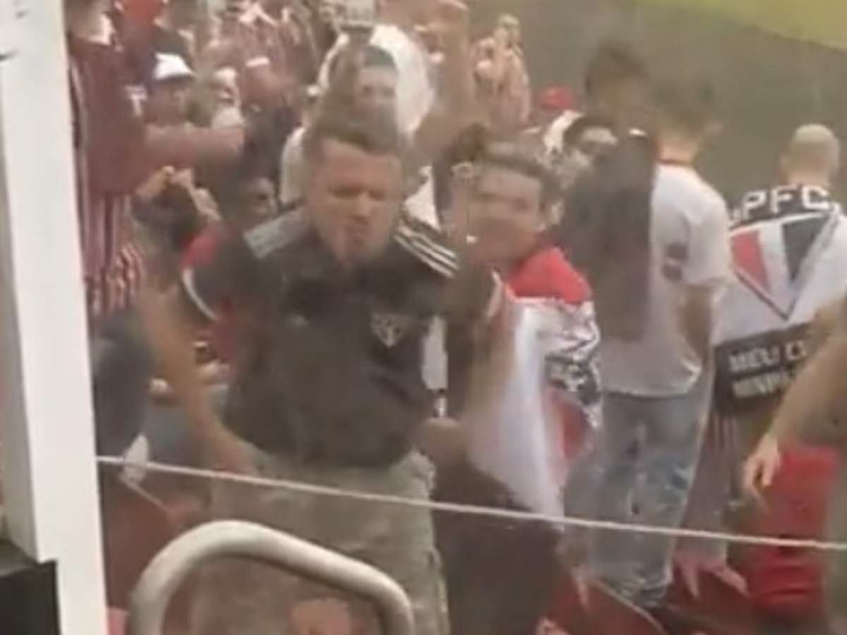 Em vídeo divulgado no Twitter, um torcedor do Fluminense mostra o momento em que é vítima de racismo. É possível ver que policias militares passam pelos tricolores paulistas no momento, mas não reparam no que estava ocorrendo.