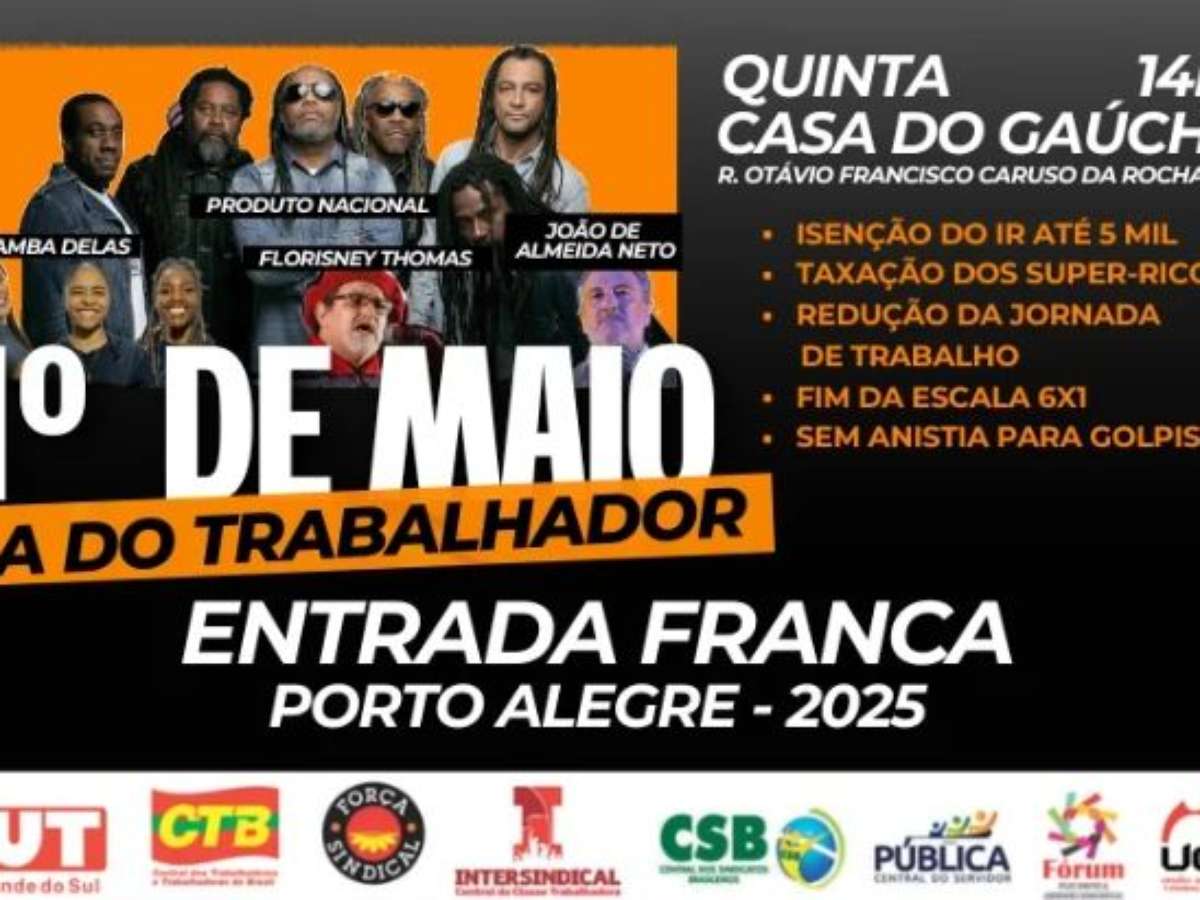 Redução da jornada de trabalho, fim da escala 6×1, taxação dos super-ricos e sem anistia são algumas das pautas deste 1º de maio em Porto Alegre. Organizada pelas centrais sindicais, a celebração do Dia Internacional do Trabalhador e da Trabalhadora acontecerá nesta quinta-feira, na Casa do Gaúcho, a partir das 14h, com entrada gratuita. Além do ato político a atividade contará com apresentações artísticas. Além de Porto Alegre, acontecem atos em Caxias do Sul, Passo Fundo, Pelotas e Tramandaí.