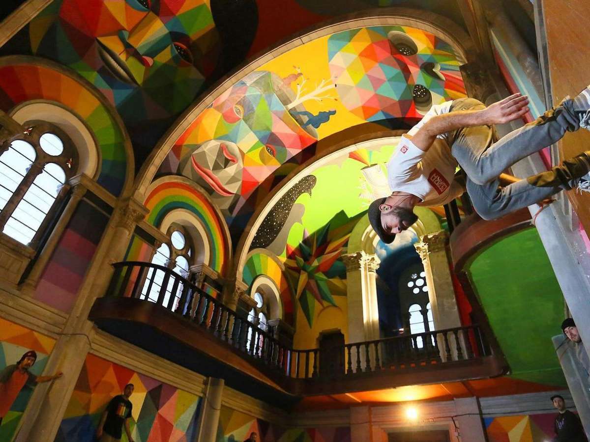 Mas este edifício centenário é agora conhecido como La Iglesia Skate, e a obra de arte é cortesia de Okuda San Miguel (também conhecido como Okudart).