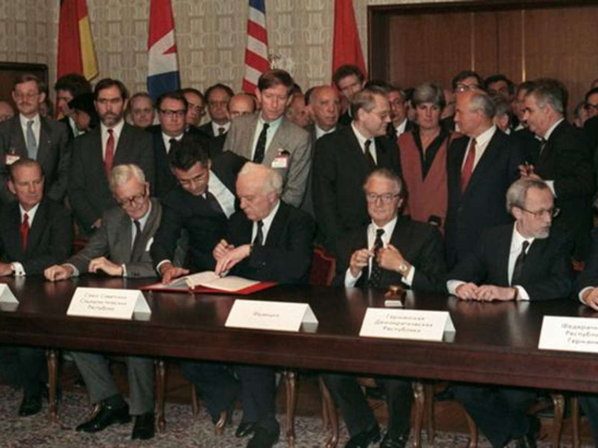 Em 12 de setembro de 1990, foi assinado em Moscou o Tratado Dois-Mais-Quatro, no qual as potências aliadas reconheciam a soberania alemã e eram acertadas as condições para a reunificação da Alemanha.As negociações do Tratado Dois-Mais-Quatro foram duras, e não sem motivo. O acordo, que definia os aspectos externos da reunificação alemã, daria respostas para questões de interesse de todo o mundo ocidental: quais fronteiras passariam a valer na Europa? As duas partes da Alemanha poderiam integrar a Otan ou deveriam ser neutras? Haveria também um tratado de paz, que selaria oficialmente o fim da Segunda Guerra Mundial? Como seria feita a retirada das tropas soviéticas da Alemanha Oriental?