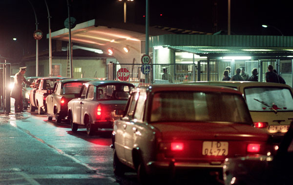 Dentro de seus carros Trabant, berlinenses aguardam para cruzar a fronteira