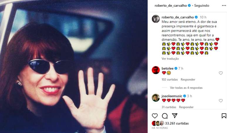 Desta vez, Roberto de Carvalho publicou uma foto de Rita Lee em um carro, usando óculos estilosos e acenando para a câmera enquanto sorri. Na legenda, se declarou: "Meu amor será eterno. A dor de sua presença impresente é gigantesca e assim permanecerá até que nos reencontremos, seja em qual for a dimensão. Te amo, te amo, te amo".