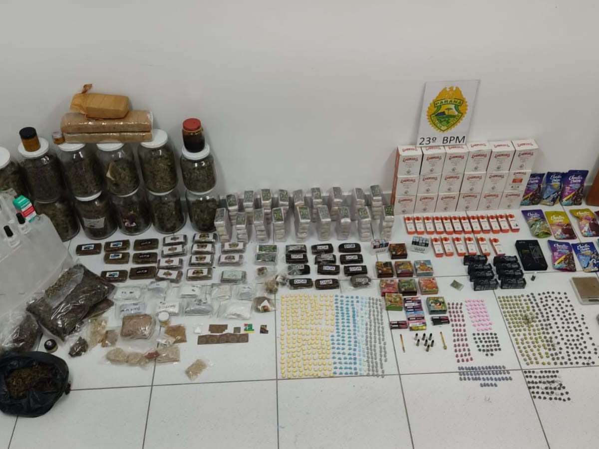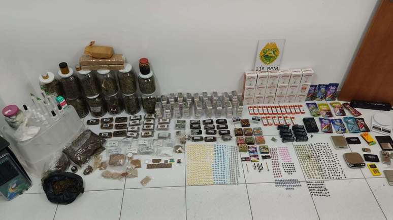 Os policiais encontraram maconha, ecstasy, MDMA em pó, sacolas para entrega das drogas, balanças de precisão e uma quantidade em dinheiro.