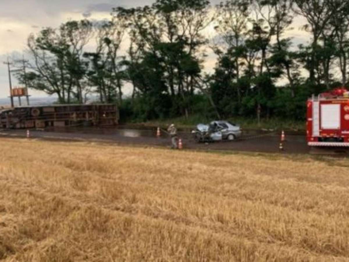 Colisão em Tapera resultou na morte do motorista do carro e ferimentos no caminhoneiro; animais que sobreviveram aguardam remoção.