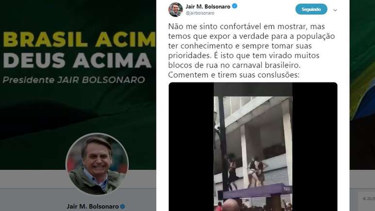 Postado pelo presidente da República no Twitter em 5 de março, o vídeo que mostrava duas pessoas dançando em cima de um ponto de táxi durante um bloco de Carnaval em São Paulo.