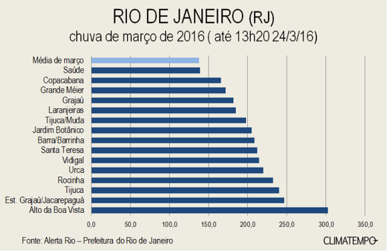 A quantidade de chuva que cai sobre uma cidade varia muito de um local para outro. A média de chuva mensal é diferente para cada bairro da cidade do Rio de Janeiro, mas apenas para uma comparação, veja quanto já choveu em 24 dias em alguns bairros, pela medição do Alerta Rio – Prefeitura do Rio de Janeiro, comparada com a média da Saúde.