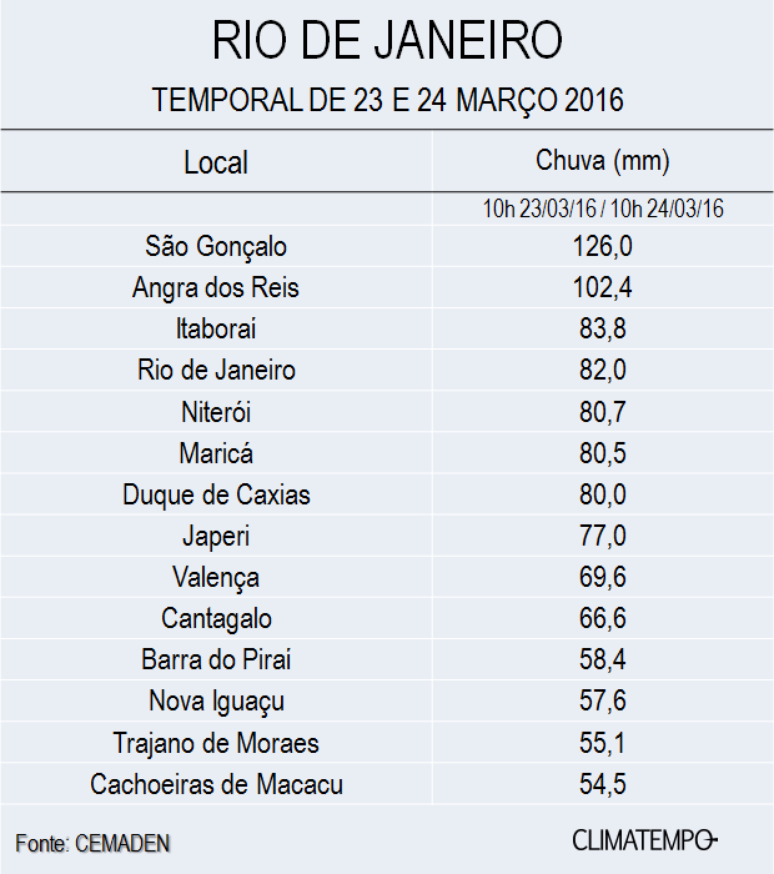 No Grande Rio, a chuva mais intensa caiu sobre São Gonçalo, com um acumulado de 126 mm entre 10 horas do dia 23 e 10 horas de 24 de março, pela medição do CEMADEN – Centro Nacional de Monitoramento e Desastres Naturais. A maior parte da chuva ocorreu no início da madrugada desta quinta-feira, 24. A região de Angra dos Reis foi um dos municípios que registraram os maiores volumes de chuva.