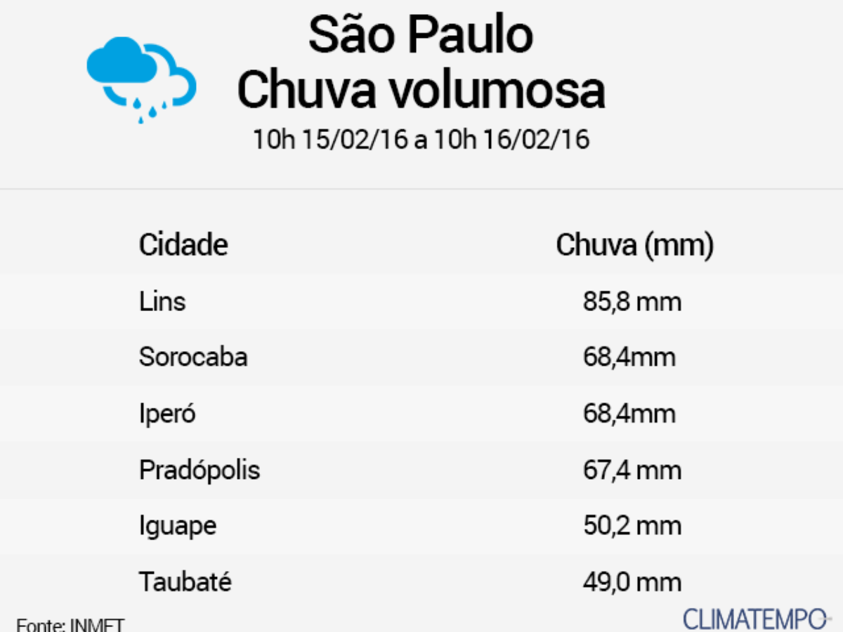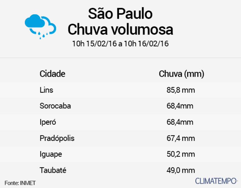 O Estado de São Paulo ainda está sujeito a temporais no decorrer desta terça-feira. Chuvas fortes e volumosas, com raios e rajadas de vento acima dos 60 km/h podem voltar a ocorrer até o fim da noite em muitas regiões do interior, na Grande São Paulo e também pelo litoral. Na região de capital, a chuva esperada para hoje não será tão volumosa como a de ontem, mesmo assim a situação ainda é preocupante, pois pode chover forte o suficiente para causar alagamentos.