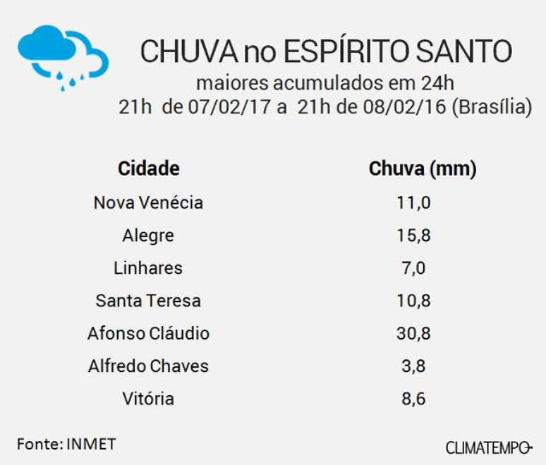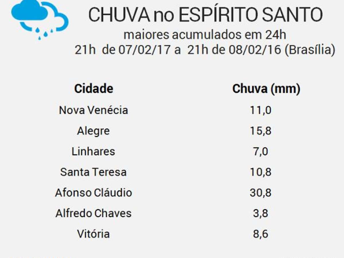 Conforme dados do Centro Nacional de Monitoramento e Alertas de Desastres Naturais (CEMADEN), em Cachoeiro de Itapemirim, no sul do Estado, o acumulado de chuva foi de 52,4 mm entre a meia-noite e 3h da madrugada. A média para todo o mês de fevereiro é de 86 mm, conforme o Instituto Nacional de Meteorologia (INMET).