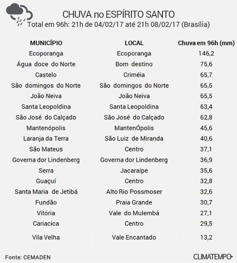 Depois de um janeiro seco, fevereiro já deu volumes de chuva elevados para algumas regiões do Espírito Santo. A tabela mostra a chuva acumulada em 96 horas (4 dias) entre a noite do dia 4 a noite de 8 de fevereiro.
