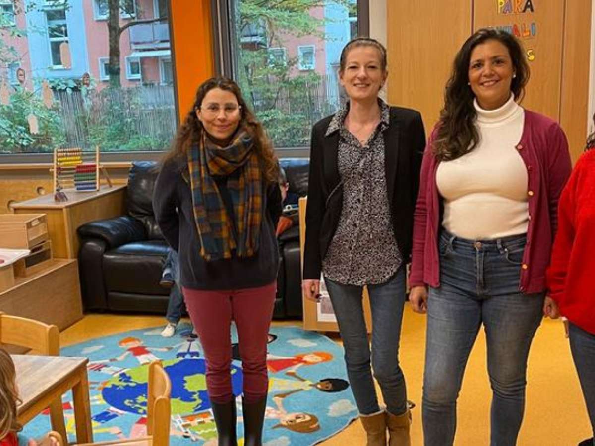 Diversos cartazes com palavras em espanhol estão pendurados nas paredes. Pais e crianças se cumprimentam com "buenos días" e se despendem com "adiós". É uma situação onde todos saem ganhando: crianças aprendem espanhol e as pedagogas que acabaram de chegar à Alemanha aprendem alemão por meio do cotidiano do jardim de infância.