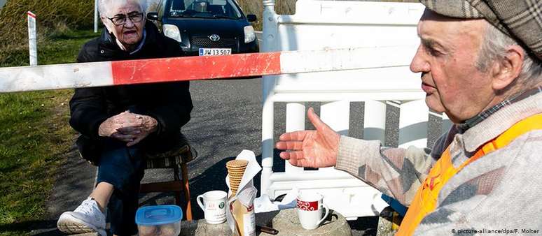 Casal de aposentados mantém relacionamento entre Alemanha e Dinamarca. Apesar da pandemia de covid-19, que os impede de viajar entre os dois países, eles continuam se vendo diariamente na fronteira, mantendo distância.Inga Rasmussen vive na Dinamarca, e Karsten Tüchsen Hansen, na Alemanha. Ambos moram em cidades próximas às fronteiras entre os dois países. Uma viagem até então rotineira, mas no momento impossível, já que a fronteira entre a Alemanha e a Dinamarca está fechada devido ao agravamento do surto de coronavírus nos dois países.