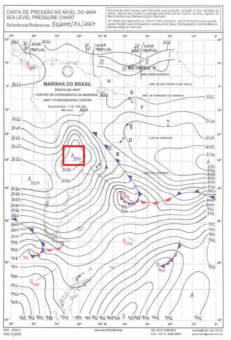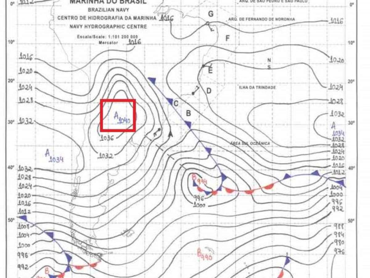 Toda massa de ar polar é um sistema de alta pressão atmosférica e uma das formas de medir sua força é pela avaliação do valor da pressão atmosférica. Esta massa de ar polar alcançou 1040 hPa (hectopascais) sobre o norte da Argentina. Este é um valor de pressão atmosférica muito elevado e raro sobre esta parte da América do Sul. A carta meteorológica analisada pela Marinha do Brasil mostra este centro de pressão.