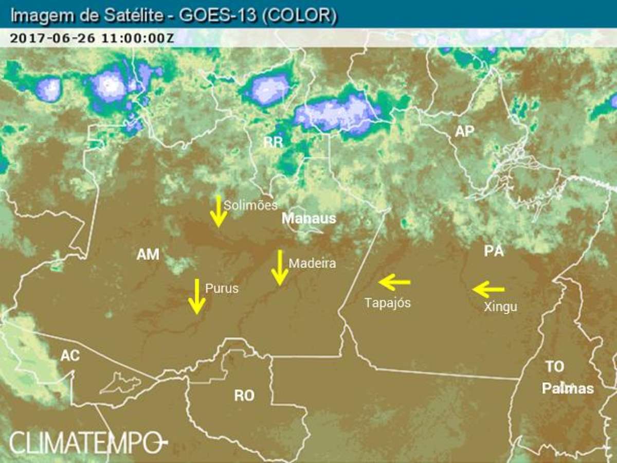 A redução dos níveis de umidade sobre a Região Norte é normal nesta época. Nos próximos dias, a chuva continua concentrada na faixa norte da Região. As pancadas de chuva continuam frequentes, e podem ser fortes, sobre o Amapá, na região de Belém, sobre o rio Amazonas, sobre o Manaus, o Solimões e o Negro e também sobre Roraima.