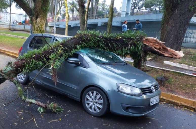 Uma cena inusitada pegou um casal de surpresa na manhã desta sexta-feira (28) em Bento Gonçalves, na Serra Gaúcha. Enquanto esperavam o semáforo abrir na esquina da rua Júlio de Castilhos com a Treze de Maio, no centro da cidade, um galho de árvore veio abaixo e atingiu o veículo VW/Fox em que estavam, com placas de João Pessoa (PB).