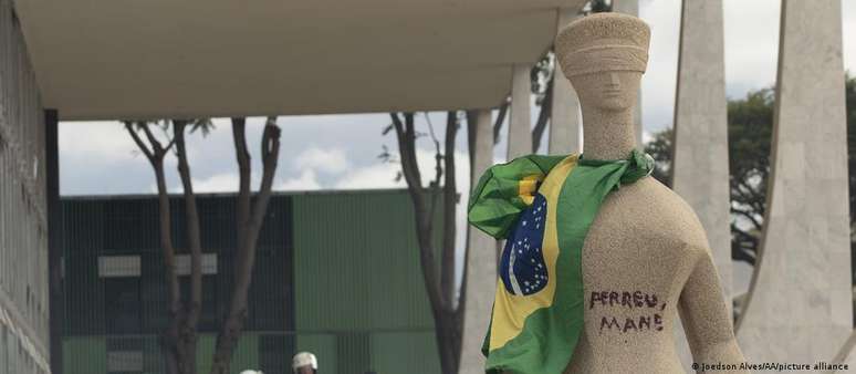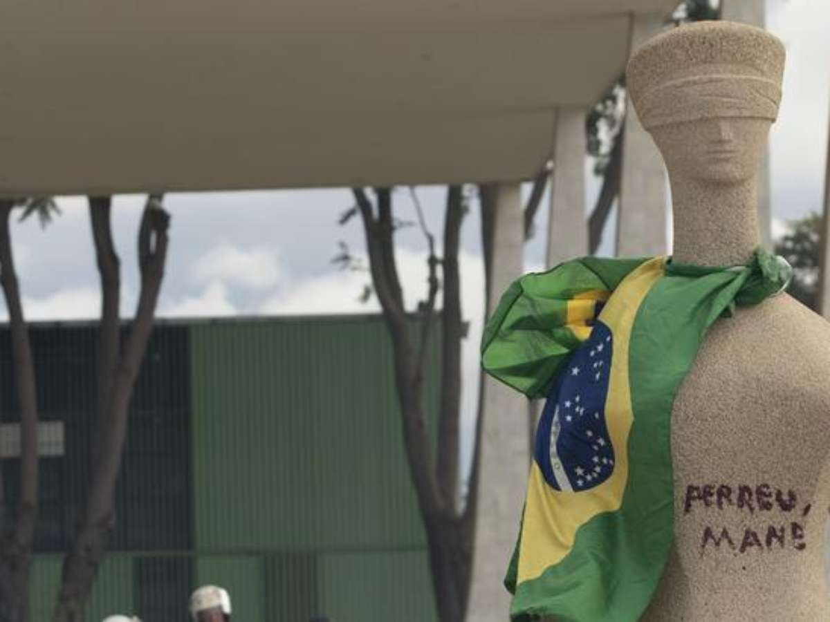 No STF, a escultura "A Justiça", do mineiro Alfredo Ceschiatti, tampouco escapou. A obra, que fica na parte externa do prédio, foi depredada e pichada.