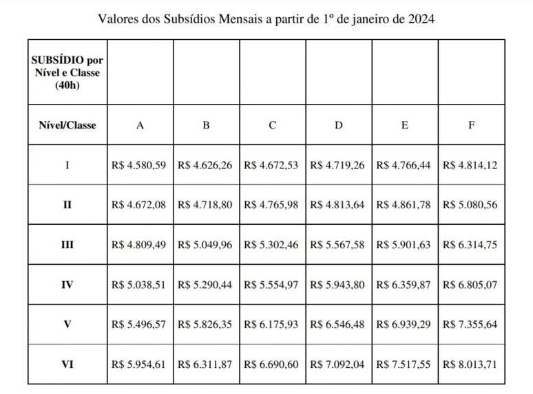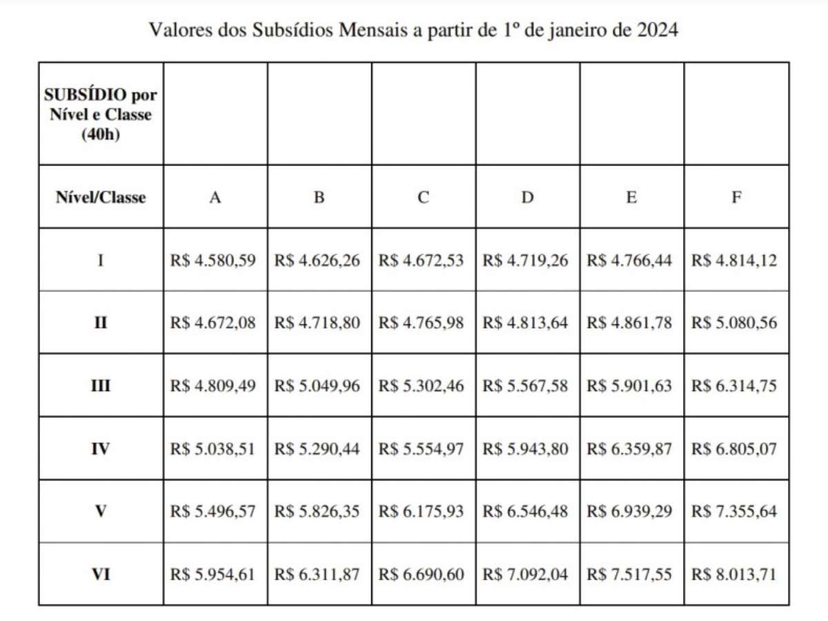 Com o reajuste, todos os professores da Rede Estadual de ensino receberão, no mínimo, o novo piso nacional, de R$ 4.580,59 para 40 horas semanais de trabalho. O subsídio de entrada para professores com licenciatura plena passará para R$ 4.809,49.