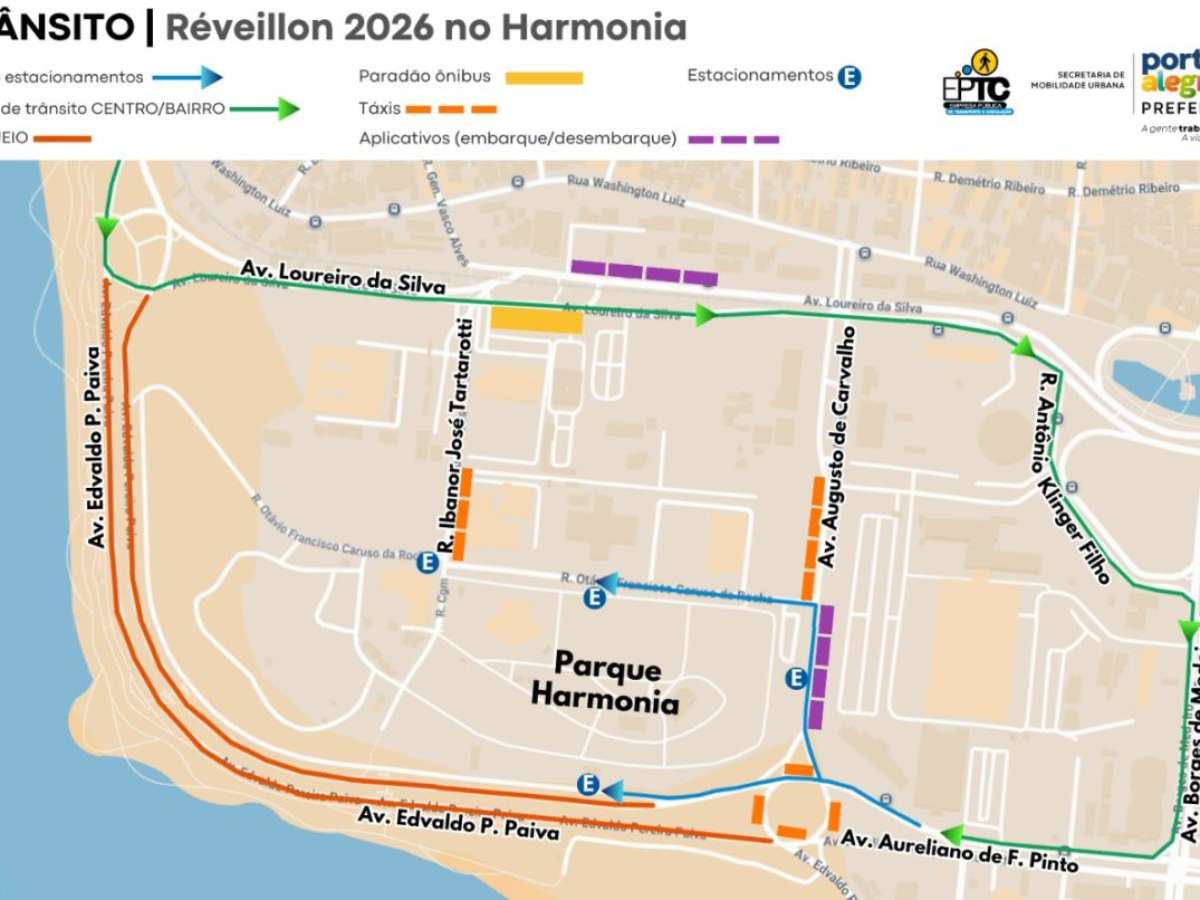 A Empresa Pública de Transporte e Circulação (EPTC) divulga as alterações de trânsito no entorno do Parque Harmonia para a festa de Réveillon 2026. Motoristas e pedestres devem ter atenção em pontos como as avenidas Edvaldo Pereira Paiva e Augusto de Carvalho. Confira abaixo: