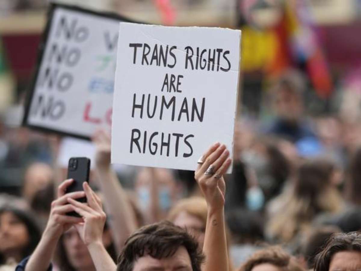 Na manifestação na Parliament Square, no centro de Londres, os manifestantes agitaram bandeiras do arco-íris LGBTQ+ e seguraram cartazes e faixas com slogans como "mulheres trans são mulheres!" e "direitos trans são direitos humanos".