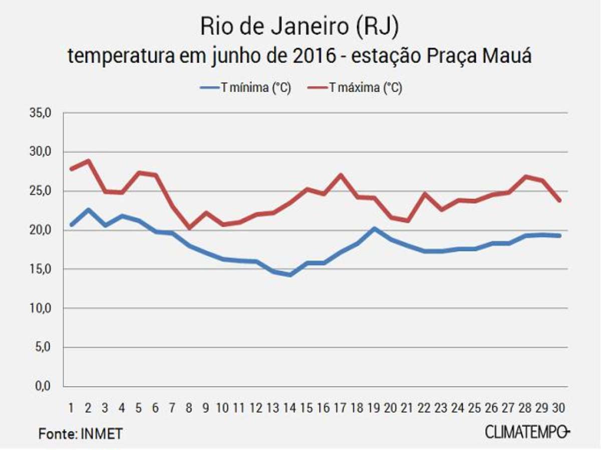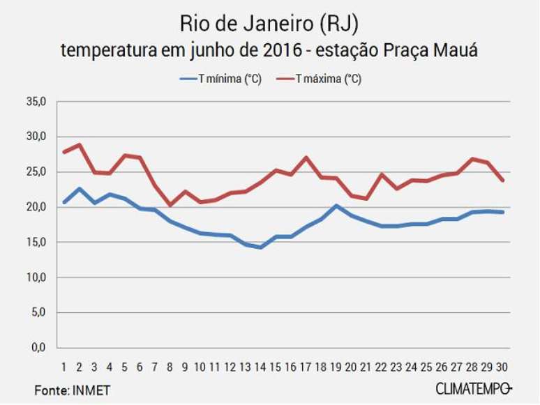 As fortes massas polares que invadiram o Brasil no mês de junho mantiveram o Rio de Janeiro com temperatura amena à tarde e deixaram as noites frias. Em junho de 2016, a temperatura à tarde nem passou dos 29°C na região da praça Mauá, no centro da cidade, onde o Instituto Nacional de Meteorologia faz medições regulares desde 2002.