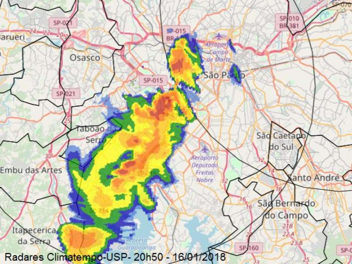 Uma forte linha de instabilidade (conjunto de nuvens cumulonimbus) se organizou sobre a cidade de São Paulo na noite desta terça-feira, 16/1/18 por causa do calor e da umidade do ar elevada. A chuva forte, com muitos raios e trovões, avançou rapidamente das zonas oeste/sudoeste da cidade para as áreas centrais e sul da capital. Tudo começou pouco antes das 21 horas. O desenvolvimento e o deslocamento destas áreas de chuva foram muito rápidos.