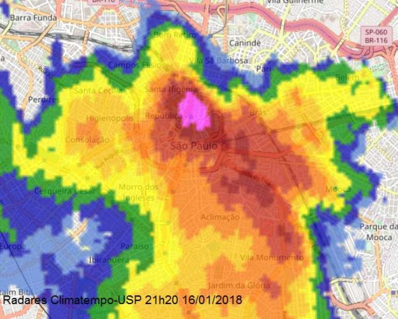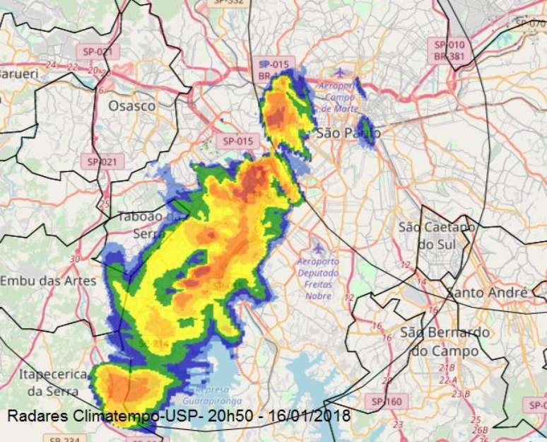 Em 1 hora choveu 28,2 mm no Campo Limpo (20h e 21h), segundo o CGE. Entre 21h e 22h choveu 29,2 mm na Vila Mariana e 22,2 mm na Sé.