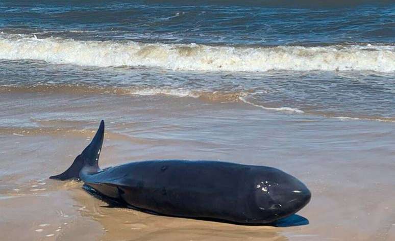 Baleia Cachalote-anão encalha na praia de Imbé; veja o vídeo