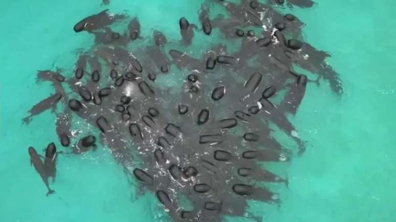 Chamou a atenção de estudiosos da vida marinha o fato de quase 100 baleias encalhadas em uma praia do Oeste da Austrália formarem um coração antes de morrerem. Apesar das tentativas desesperadas de resgate e dos inúmeros voluntários ajudando os animais, cerca de 50 morreram agonizando e os demais foram sacrificadas nesta quinta(3).