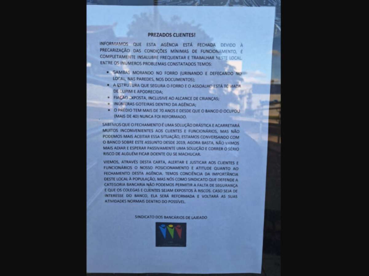 O Ponto de Atendimento do Banrisul no Bairro Teutônia, em Teutônia, amanheceu fechado nesta segunda-feira (12/6) devido a questões sanitárias e risco iminente de desabamento do telhado. A decisão drástica foi conduzida pelo Sindicato dos Bancários de Lajeado, após relatos do presidente da entidade, Edson Antônio Leidens, sobre a frequente queda de pedaços do teto e invasões de animais, incluindo gambás, que caíam do forro, inclusive durante o expediente. A ação tem o objetivo de preservar a segurança dos funcionários e clientes do banco.
