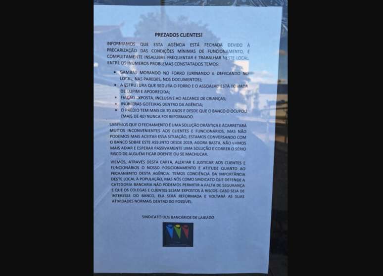 Segundo o presidente do sindicato, as condições precárias do local são conhecidas desde 2019, quando foram iniciadas as negociações e os alertas à superintendência do Banrisul. No entanto, nenhuma medida teria sido tomada até o momento, o que levou à decisão de fechamento do ponto de atendimento. Edson Antônio Leidens reforça que a ação foi necessária para evitar riscos à integridade física das pessoas envolvidas. Nesse sentido, o sindicato enfatiza que não se pode negociar vidas e que a medida extrema foi tomada para garantir a segurança de todos.
