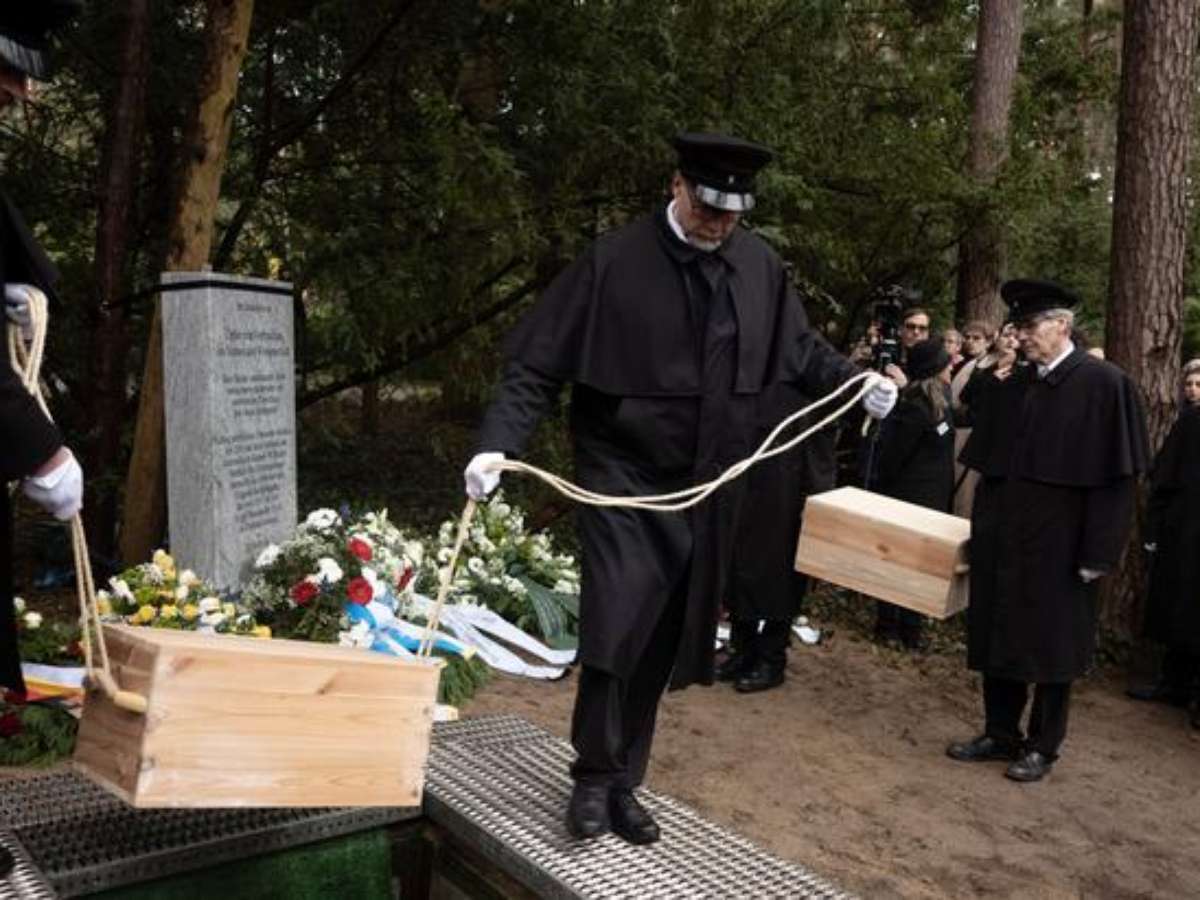 Na quinta-feira, os ossos foram enterrados em cinco caixas de madeira no cemitério Waldfriedhof Dahlem, em Berlim, diante de uma lápide cinza onde se lia "Vítimas em nome da ciência".