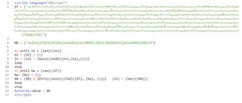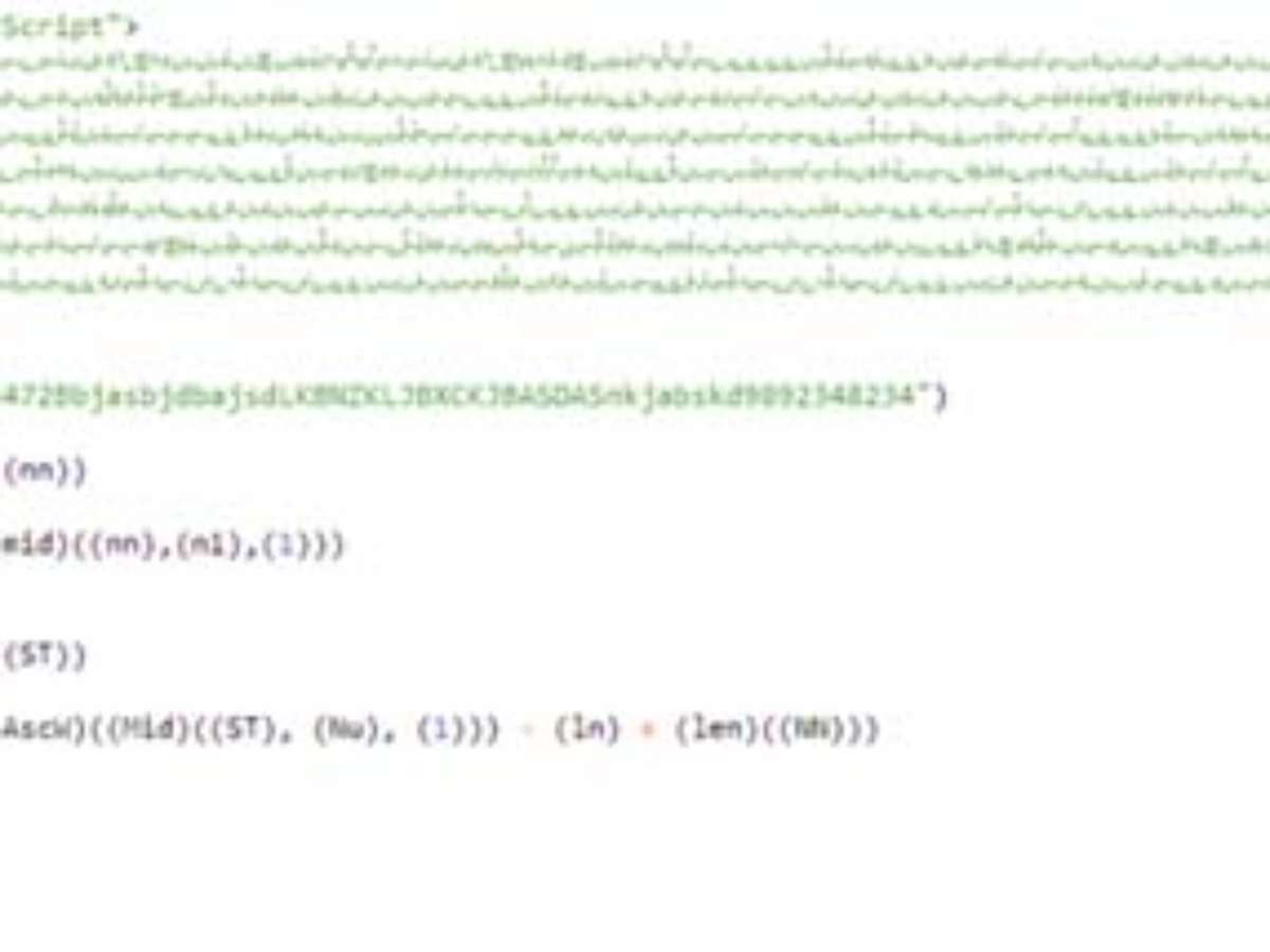 Por outro lado, o ofuscamento malicioso geralmente vai além e criptografa o código-fonte do script para abrir no momento em que o script é executado. Essas técnicas ocasionalmente produzem resultados incomuns, como no exemplo abaixo.
