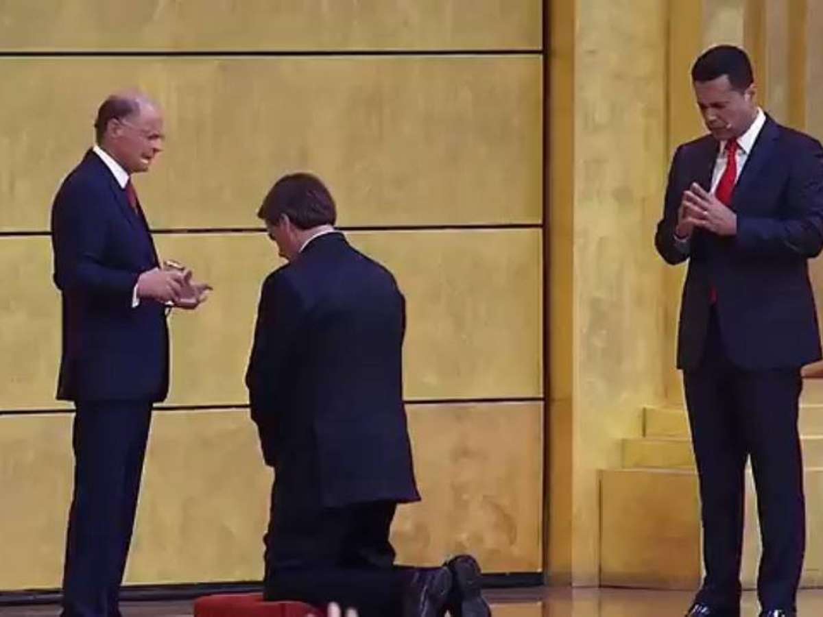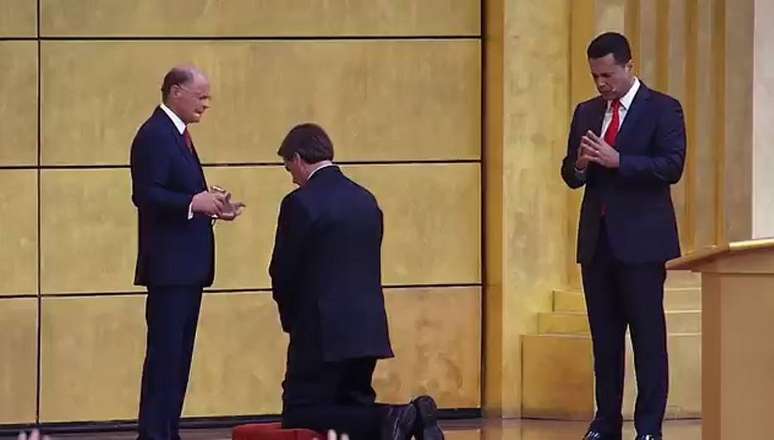 A pedido do bispo, Bolsonaro se ajoelhou diante do altar e de costas para os fiéis. Macedo, então, começou contando que, no passado, ele convidou para ir à igreja um outro candidato presidencial, que acabou virando presidente, mas que não foi possível levá-lo. O bispo não especificou a quem ele estava se referindo.