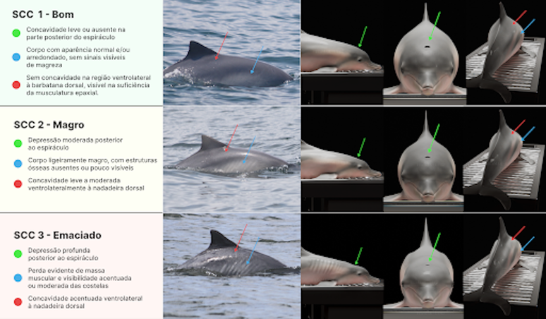 Fotografias (meio) e ilustrações digitais (dir.) de diferentes condições corporais de botos-cinza. O aparecimento da costela do animal não é um bom sinal. SCC = Score da Condição Corporal.Ilustração: Deyverson Silva/ECoMAR-UFRJ.O fantasma da Guanabara e o futuro climático