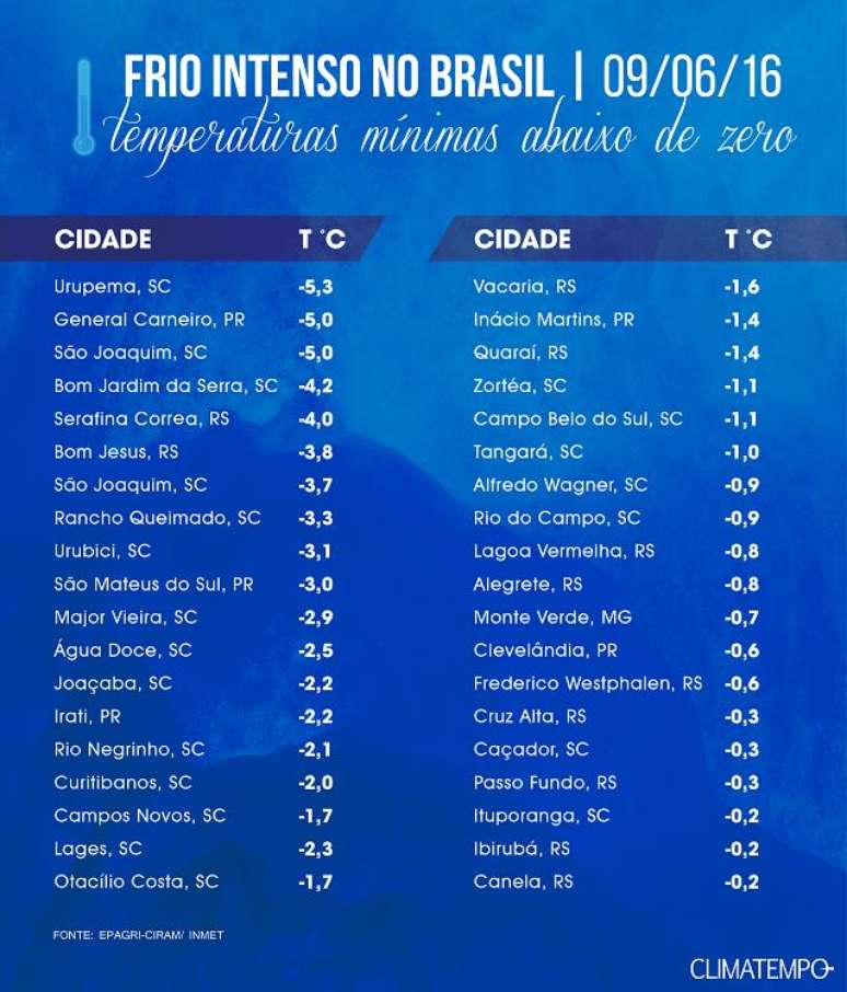 O frio tem estado literalmente congelante no Sul do Brasil nos últimos dias, mas temperaturas abaixo de zero já são registradas também no Sudeste. No dia 9 de junho, com as medições do Instituto Nacional de Meteorologia e do Epagri-Ciram, 38 cidades registrarem temperaturas abaixo de zero e no dia este número aumentou para 64!