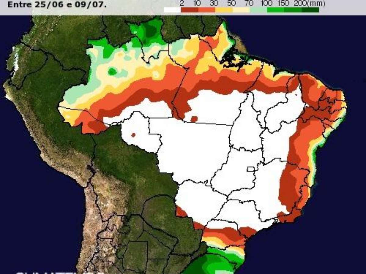 A chuva sobre o Brasil até por volta do dia 9 de julho ficará praticamente toda concentrada sobre o , nas áreas litorâneas do leste do Nordeste, sobre e o noroeste do . Em particular no Rio Grande do Sul, muitas áreas do estado poderão acumular mais de 200 mm de chuva em 15 dias. Na costa leste do , os volumes de chuva acumulados em 15 dias, até 9 de julho, podem alcançar marcas de 100 a 150 mm.