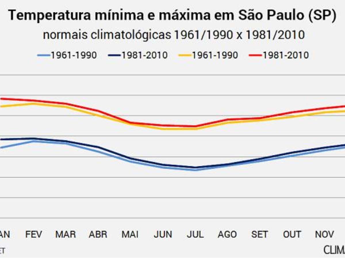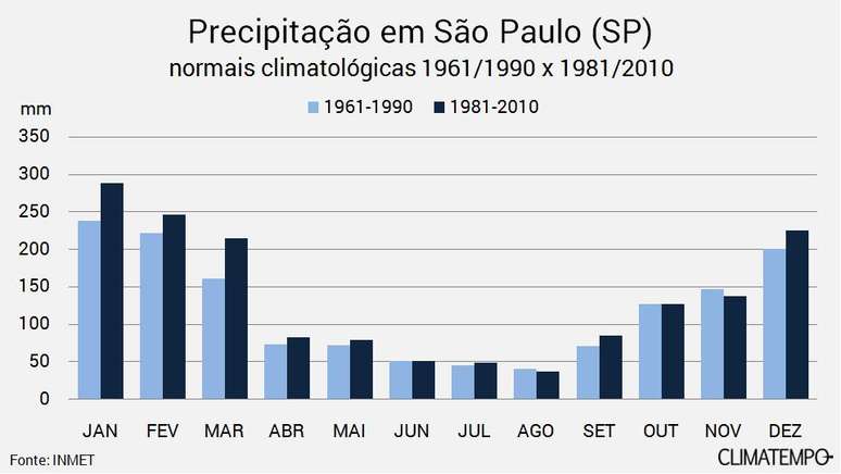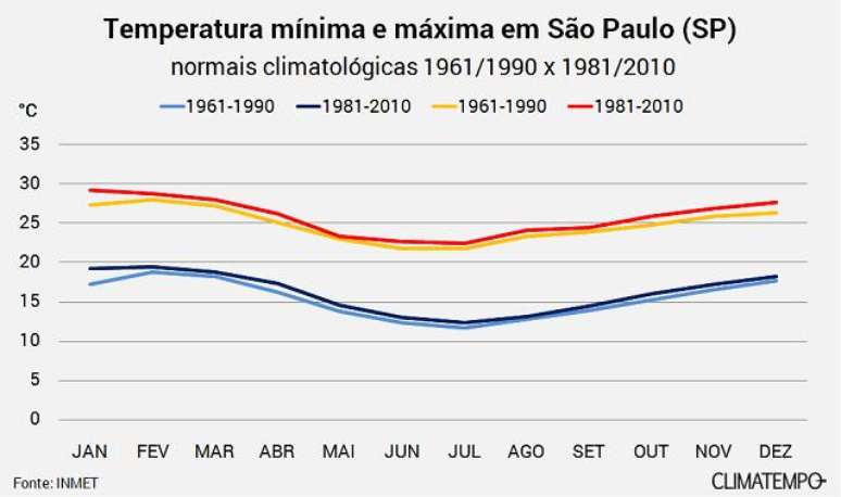 Comparando as velhas normais climatológicas para a cidade de São Paulo do período de 1961 a 1990 com as novas normais, de 1981 a 2010, é possível verificar facilmente que a capital paulista ficou mais quente. Em relação à precipitação mensal, houve um acréscimo em relação às médias de 1961 a 1990 em quase todos os meses. Mas a normal de precipitação para agosto, que já era a mais baixa na escala anual, ficou um pouco menor.